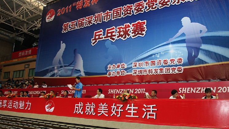 開幕式于10月29日上午8:30舉行。市國資委黨委書記柏立新,特發(fā)集團黨委書記、董事長劉愛群、黨委副書記、總經(jīng)理施長躍,國資委黨辦主任李明、副主任張曉中、唐明通,以及國資委系統(tǒng)企業(yè)的領(lǐng)導(dǎo)出席開幕式。開幕式由集團總經(jīng)理施長躍主持。此時的羅湖體育館一派歡快、濃烈的氛圍:主席臺正面高樹印有本次比賽徽標(biāo)和“2011‘特發(fā)杯’第五屆深圳市國資委黨委系統(tǒng)乒乓球賽”字樣的巨幅背景板,四周掛滿國資委和系統(tǒng)各企業(yè)的旗幟與祝比賽圓滿成功的條幅,以及“暢享運動魅力,成就美好生活”、“樹競技風(fēng)尚,展國企風(fēng)采”等標(biāo)語,各單位啦啦隊和觀眾坐滿看臺。伴隨著熱烈歡快的運動員進行曲,來自國資委系統(tǒng)21家單位的22支代表隊,在美麗端莊的引導(dǎo)員帶領(lǐng)下,隨著高舉國資委旗幟的旗手、護旗手依次入場,隊員們意氣風(fēng)發(fā),精神飽滿,步伐矯健,隊列整齊。在全體起立奏唱國歌、莊嚴(yán)的升國旗儀式后,集團董事長劉愛群和國資委黨委書記柏立新分別代表承辦方和組委會先后致辭。