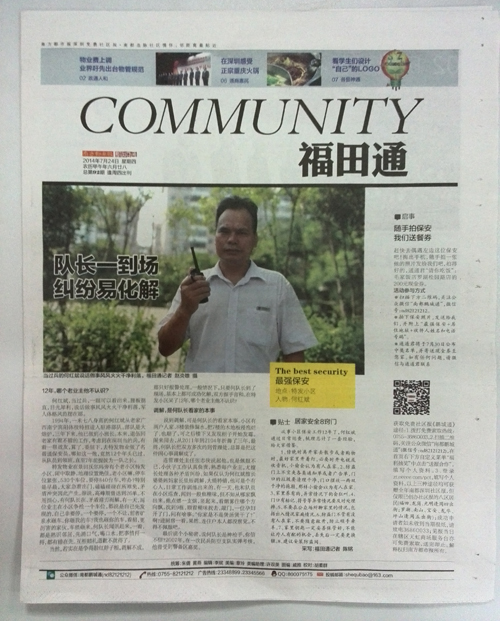 在2014年7月24日《南方都市報》出版發(fā)行的第92期深圳社區(qū)報《鵬城通》的“福田通”版中,刊出了“最強保安”的專題報道,特發(fā)物業(yè)公司特發(fā)小區(qū)管理處保安隊長——何紅斌正是這一期報道的主人公。